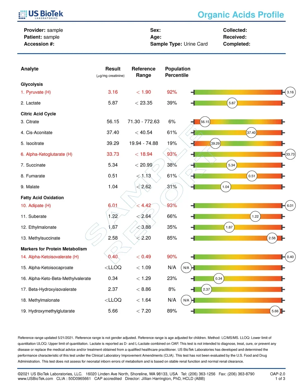 Organic acids testing – Provides insight into energy metabolism, mitochondrial function, oxidative stress, and nutrient deficiencies.